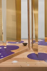 “Touching Down on Land and Touching Down on Water XIV: Itsuura Coast” (2013) is Rokkakudo, a small hexagonal temple erected on the edge of Itsuura Coast in Ibaraki prefecture. This minimalist temple designed by Okakura Tenshin had the dimension of roughly 4 and half tatami matts (8.4 square-meters), and Nakanishi’s sculptural work has a foundation of the exact same size with 6 brass rectangular plates hung from above. As the painting stands vertically, it emphasizes the weak and unstable axis of the horizontal plane. Nakanishi finds the perfect horizontal plane in tea ceremony rituals continued since the Muromachi period. Known for its simplicity of fusing Buddhism and the “Way of Tea”, this temple was a place of meditation where one could gaze at the flat water plane in a tea cup, while overlooking the horizon of the Pacific Ocean. The work makes a tribute to the Rokkakudo temple, which was destroyed by the Great East Japan Earthquake in 2011, through insinuating subtle references: thin brass plates hung vertically and reflections of small metal balls glitter on sand.