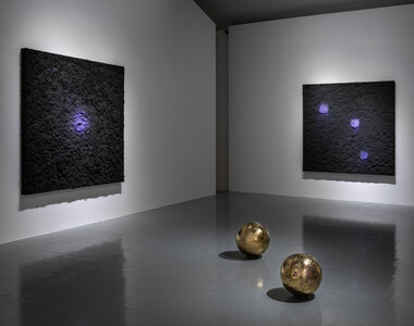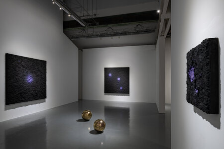 黒地に紫が印象的なキャンバスが壁面を取り囲んでいます。おが屑と他素材を調合した独自のメディウムを表面に施し、乾く過程で表面に生じたひび割れをも自然のジェスチャーとして包摂した絵画作品です。ソディの素材への探求心は、かつて化学工学を学び、またアントニ・タピエス(1923-2012)をはじめとする美術家達によってもたらされた多様なバックグランドによって培われています。また、キャリアの初期の頃から使用しているおが屑については、画家ジョルジュ・ブラック(1882-1963)の実践に感化されたことも明かしています。