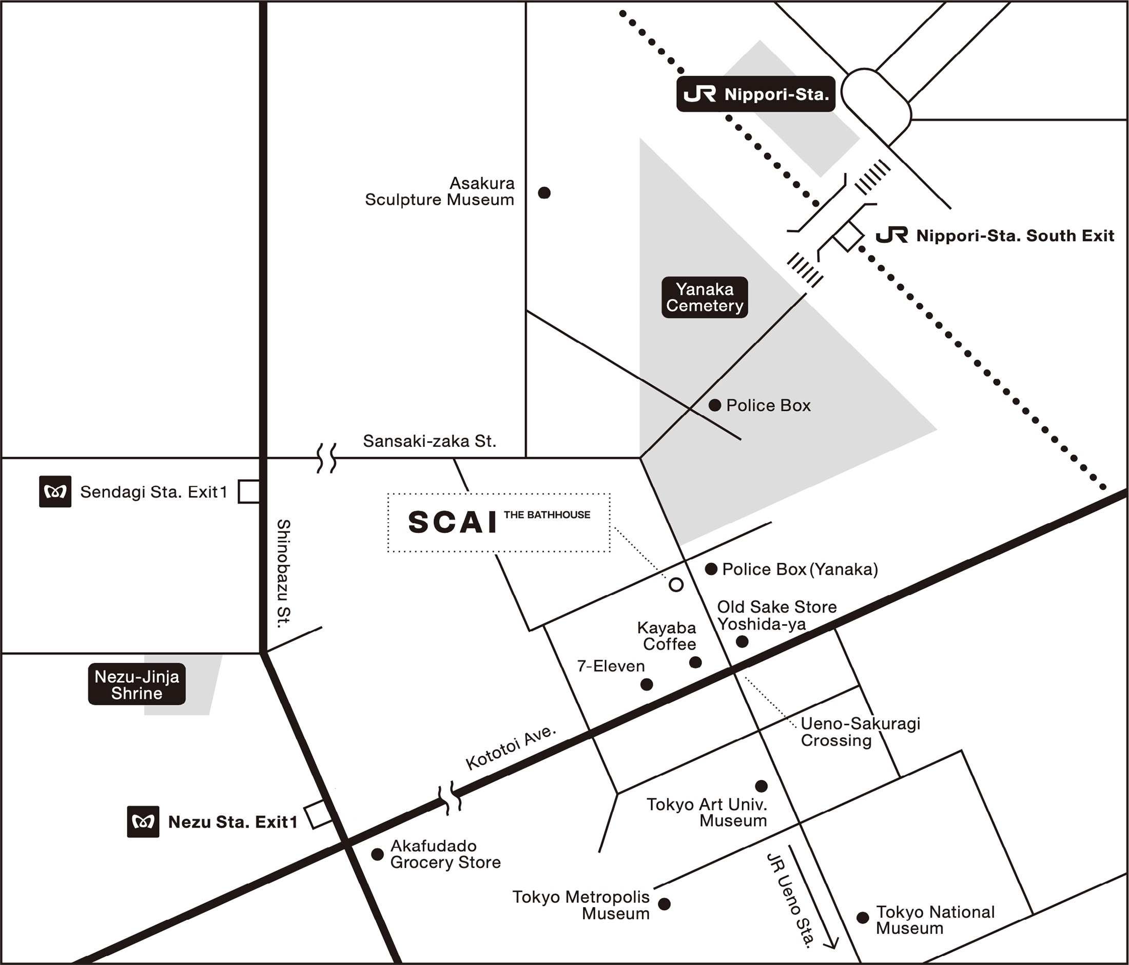 Take Exit 1 at Nezu station. At the street junction, take the crossing and the road between Yoshino-ya (orange store banner) and Akafudado grocery store. Walk up the slope about 10 mins. Past a 7-eleven, turn on the first left at Kayaba Coffee. The gallery is located on your left after a minute walk, opposite a police box.