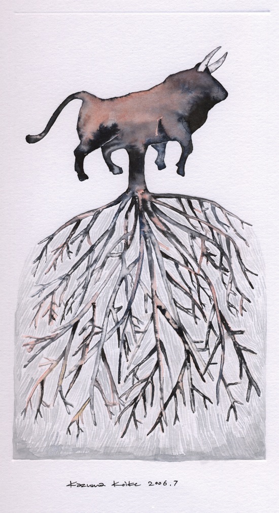 幼少期を南米、スペインなどラテン世界で過ごしてきた小池一馬のアプローチはもっと直接的に物語世界につながっていきます。神話にも似た世界観を持ち得た平面作品と彫刻は、古代文字のような神話性をたたえており、暗い階段を下りて地下世界へ遺跡を発見しにいくような興奮を呼び覚まします。