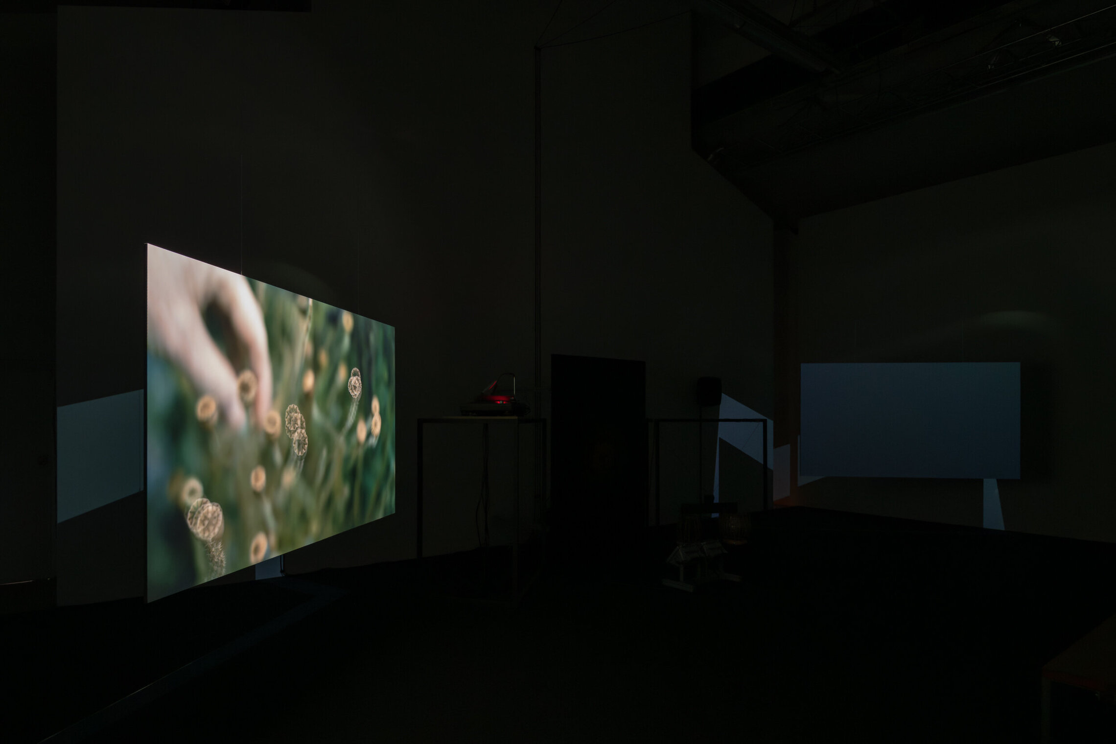 本展の中心となるのは、初公開となる2チャンネル映像のインスタレーション《Cymatic Ceremony》(2024年)です。映像がドラムセットのライブ演奏とシンクロするこの作品は、振動現象を研究する一分野であるサイマティクス*1に言及しています。映し出されるのは、森の中にいるアーティスト へルガ・ドロテア・ファノンであり、クラドニプレート*2の上に種を撒き、儀式めいた行為を続けています。111Hzを含む様々な周波数で共鳴する金属プレートは、歌い手(ジュリエット・フレイザー)の声に反応して複雑なパターンを見せます。固有の振動数と共鳴することで現れるこれらの模様は、サイマティックパターンと呼ばれ、雪の結晶や貝殻のような多くの自然形態に見出すことができます。本作では、スイスの医師であり人智学の提唱者でもあったハンス・ジェニーが研究したこれらの形態を参照しつつ、神秘的な「Om(オーム)」の周波数を111Hzと仮定しています。