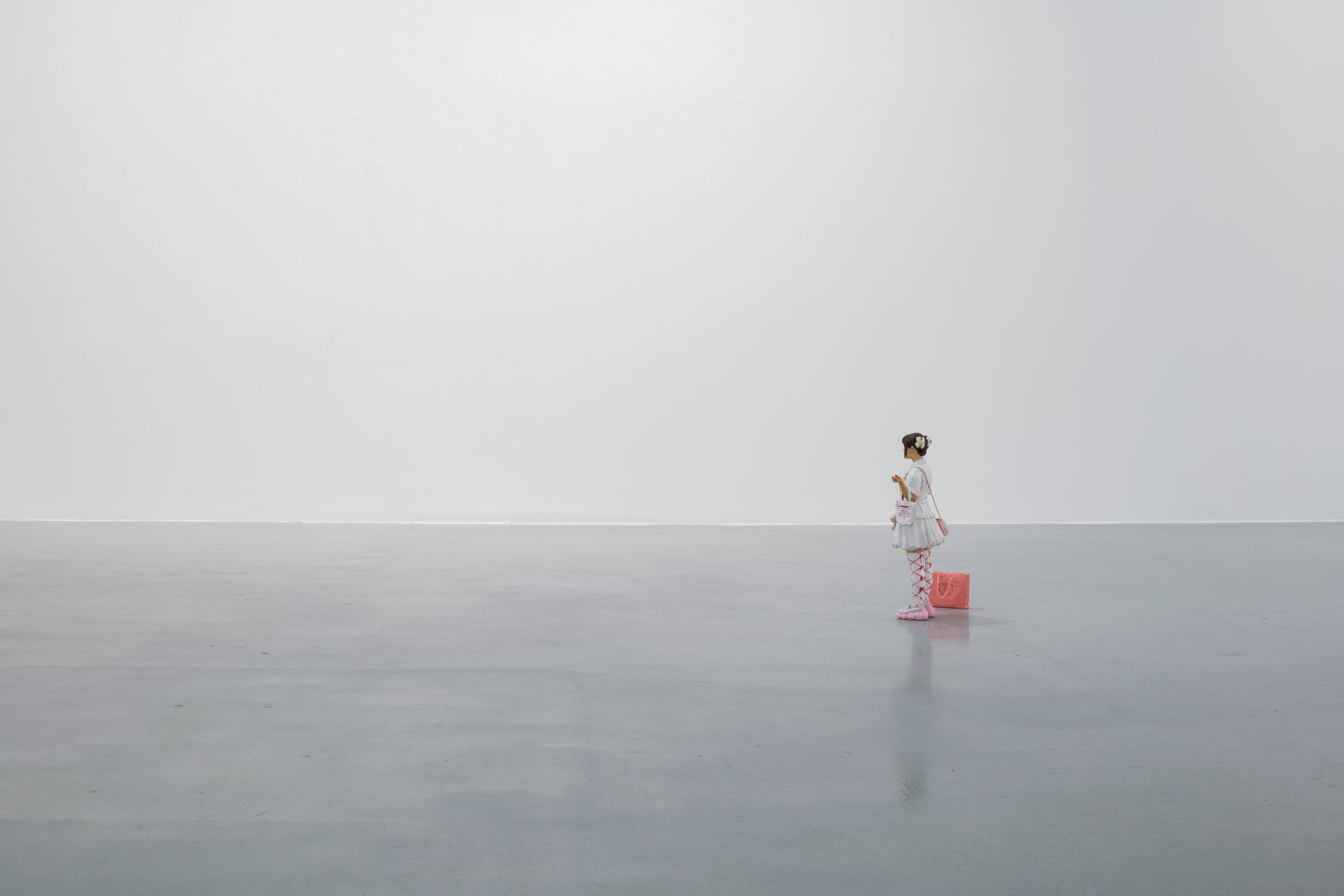 青いハットに、左耳のピアス、右腕のタトゥー。日本人の青年をモデルにした彫像は、どこか遠くを見るような中立的な表情を浮かべています。スタイリッシュな外見は正に現代を生きる東京の若者そのもの。一方で右手に携えたカメラは、彼の注ぐ情熱の矛先を現しているのかも知れません。床に直接置かれた作品は、古典的技法に裏打ちされた確かな造形力とともに、およそ60センチの高さの縮尺された人物像として自立しているのが特徴です。「ファッションを切り口に現代を捉えようとしてきた」と鈴木自身が語るように、流行を纏う彼らの姿とその精緻なディテールは、近距離で観察のまなざしを向けた途端、木の繊維のざらつきとともに鑑賞者の眼前に立ち現れます。トーマス・ルフやアウグスト・ザンダーといった写真家の影響を自覚する鈴木の実践は、一方で写真の写実性や客観性を単純になぞるのではなく、身体性・時間性・素材性を通じた、より触知的なリアリティとしての現実の再構築を試みているようです。膝小僧に刻まれた蝶のタトゥーが印象的な女性像は、都内の大学に留学中であるという中国出身の少女がモデルです。多国籍のルーツを持つ仁王立ちの青年像は、真正面を見据える挑戦的なまなざしが鑑賞者に強い印象を与えます。さらに、ロリータファッションに身を包むのは、韓国出身の少女。東京の流行発信地、サブカルチャーの中心である原宿から飛び出て来たような姿が鮮明に浮かびます。展示室に点在する四体の像は、日本のカルチャーに憧れ、あるいは失われた民主主義を求めて東京に集った若者たちの縮尺された写像を含み、東京という大都市の「今」を、鮮烈な現実感と共に鑑賞者に訴えかけて来ます。台座なしで作品を空間に置く実践は、建築と彫刻、あるいは鑑賞者との関係を再構成する試みでもあると作家は言います。その配置は、視線を交わすことのない孤立した人物たちを通じて、都市の中で埋没し、切り離され、孤独に生きる私たち自身の姿を映し出すかのようです。